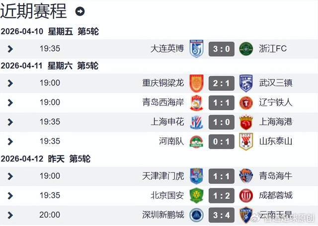 中超第5轮的8场比赛已经全部战罢,具体战况如下:大连英博3-0浙江、重庆铜梁龙2-1武汉三镇、青岛西海岸1-1辽宁铁人、上海申花1-0上海海港、河南0-1山东泰山、天津津门虎1-1青岛海牛、北京国安1-2成都蓉城、深圳新鹏城3-4云南玉昆。